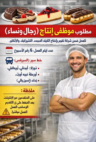 مطلوب موظفي إنتاج (رجال ونساء) للعمل ضمن شركة تقوم بإنتاج الكيك المجمد، التشيزكيك، والإكلير.