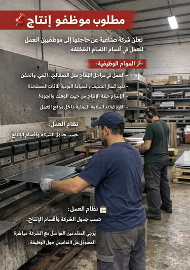 تعلن شركة عن حاجتها إلى موظفين للعمل في أقسام الإنتاج المختلفة.